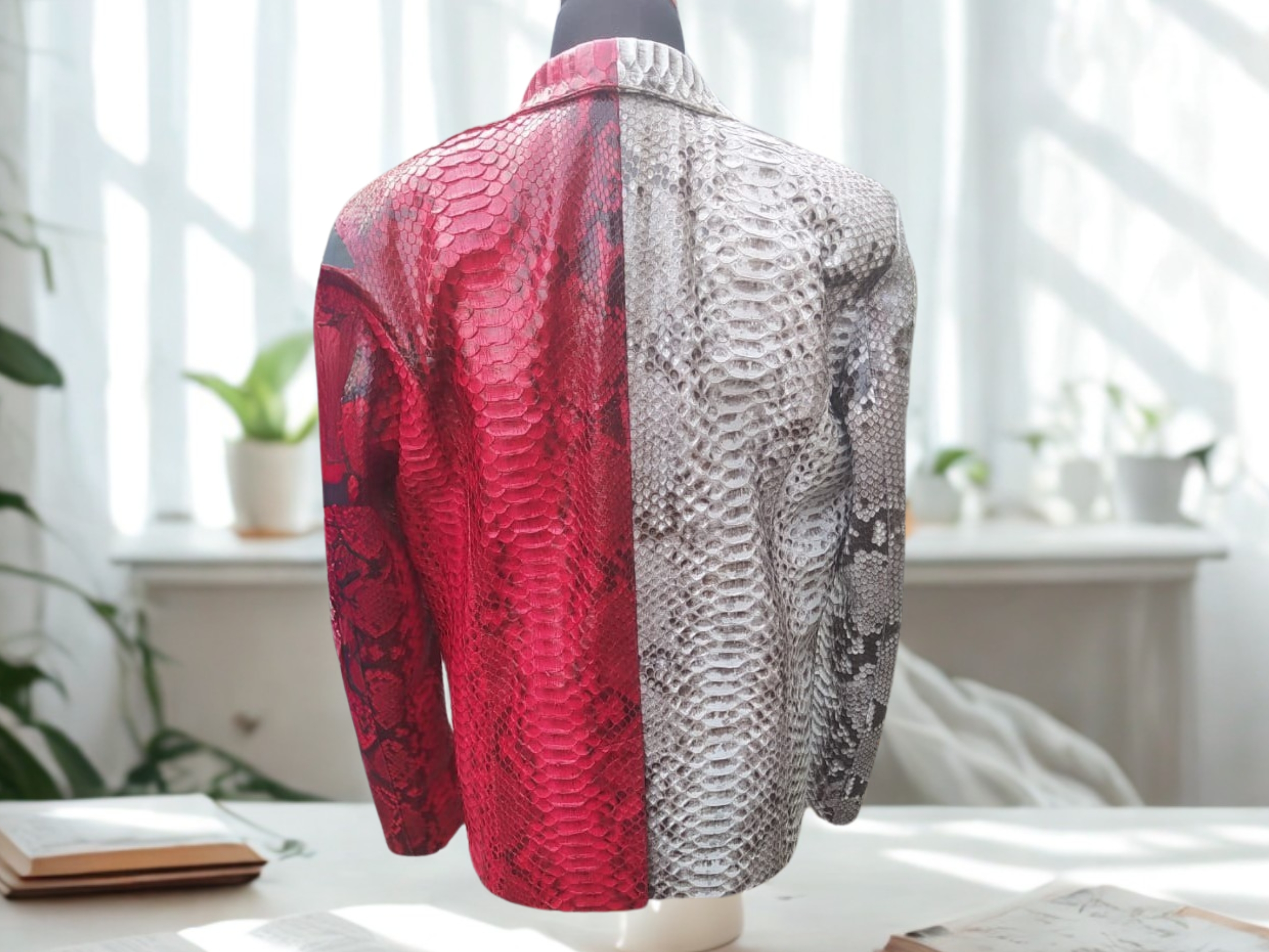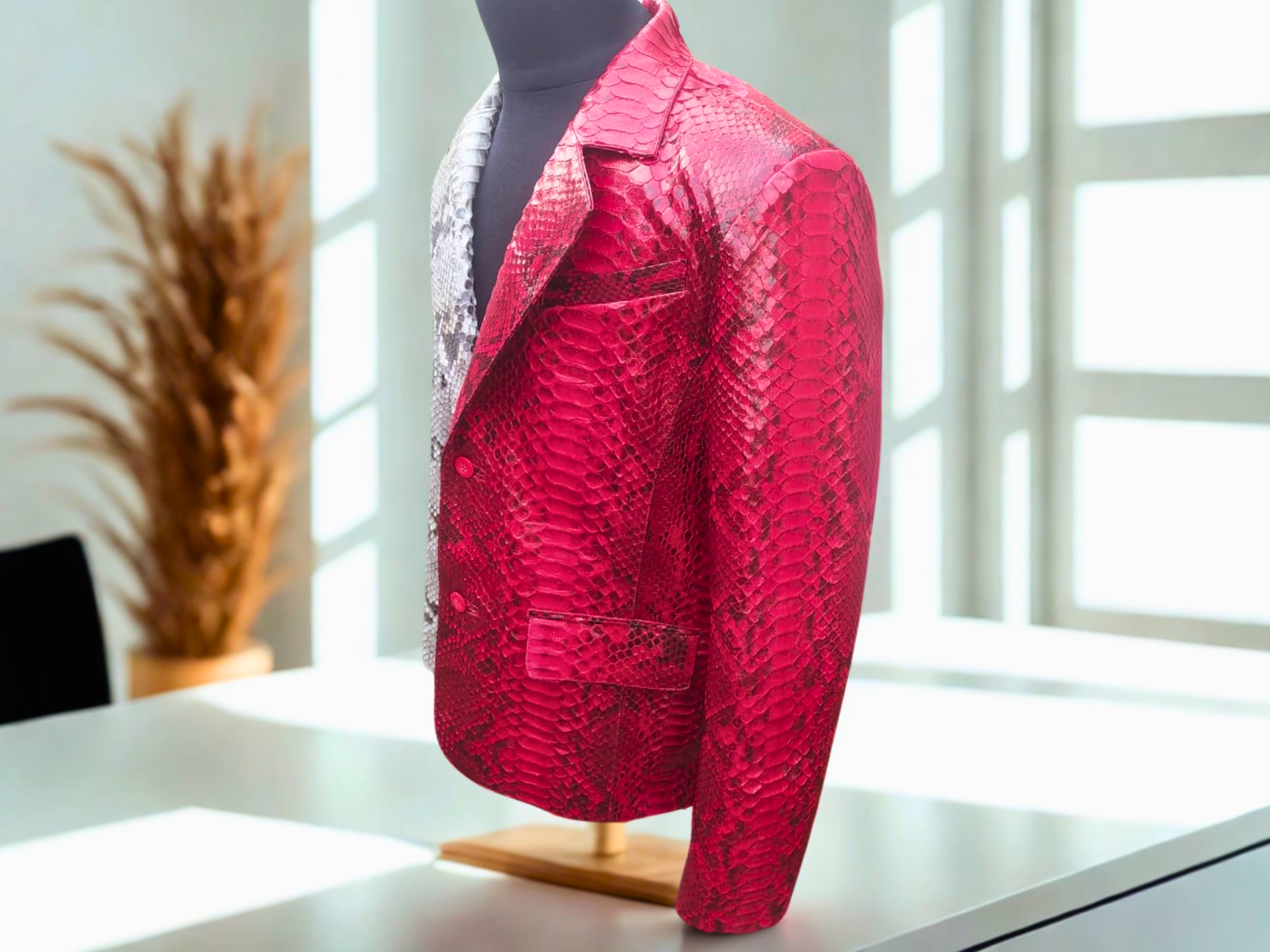 Elevate your style with our exclusive Snakeskin Blazer crafted from genuine python snake skin leather. This luxurious statement piece features a stunning natural gray color beautifully mixed with vibrant red accents. Designed with practical elegance in mind, it includes secure button closure and four convenient pockets. Perfect for those who demand both exceptional quality and head-turning sophistication in their wardrobe.