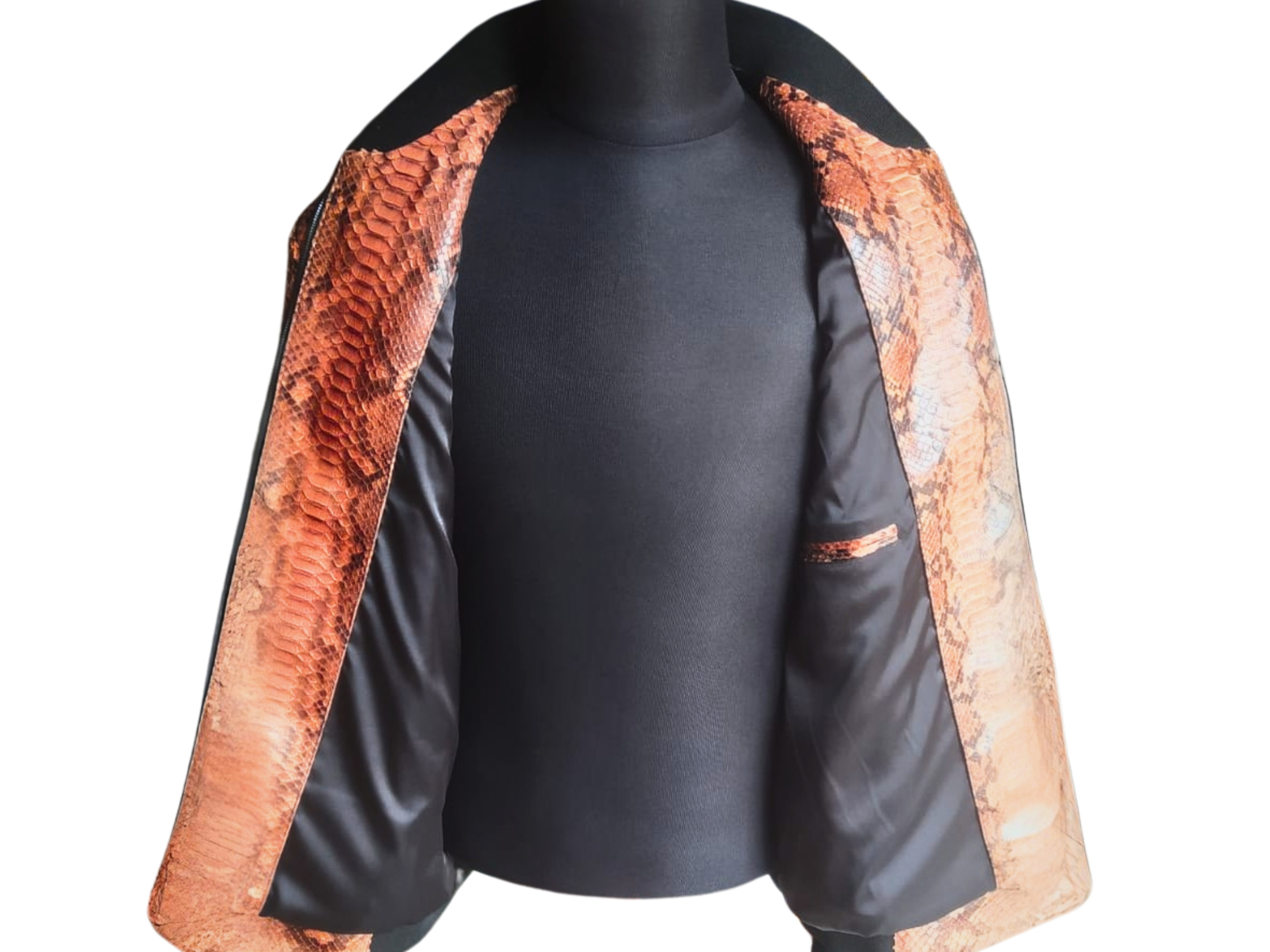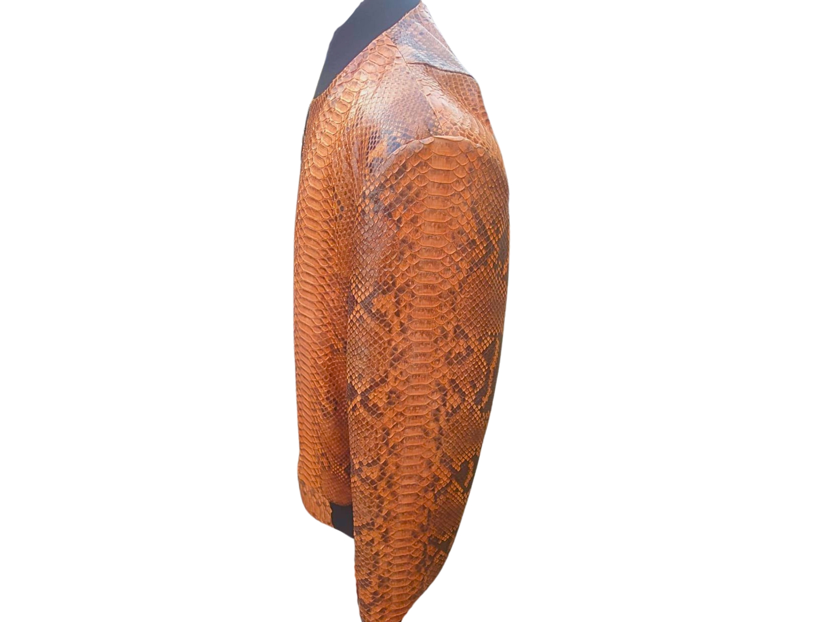 Elevate your style with our Brown Bomber Leather Jacket crafted from genuine python snake skin leather. This luxurious statement piece combines timeless bomber silhouette with exotic texture for unmatched sophistication. The rich brown hue pairs effortlessly with any outfit, while the premium python leather ensures durability and a head-turning appearance that sets you apart from the crowd.
