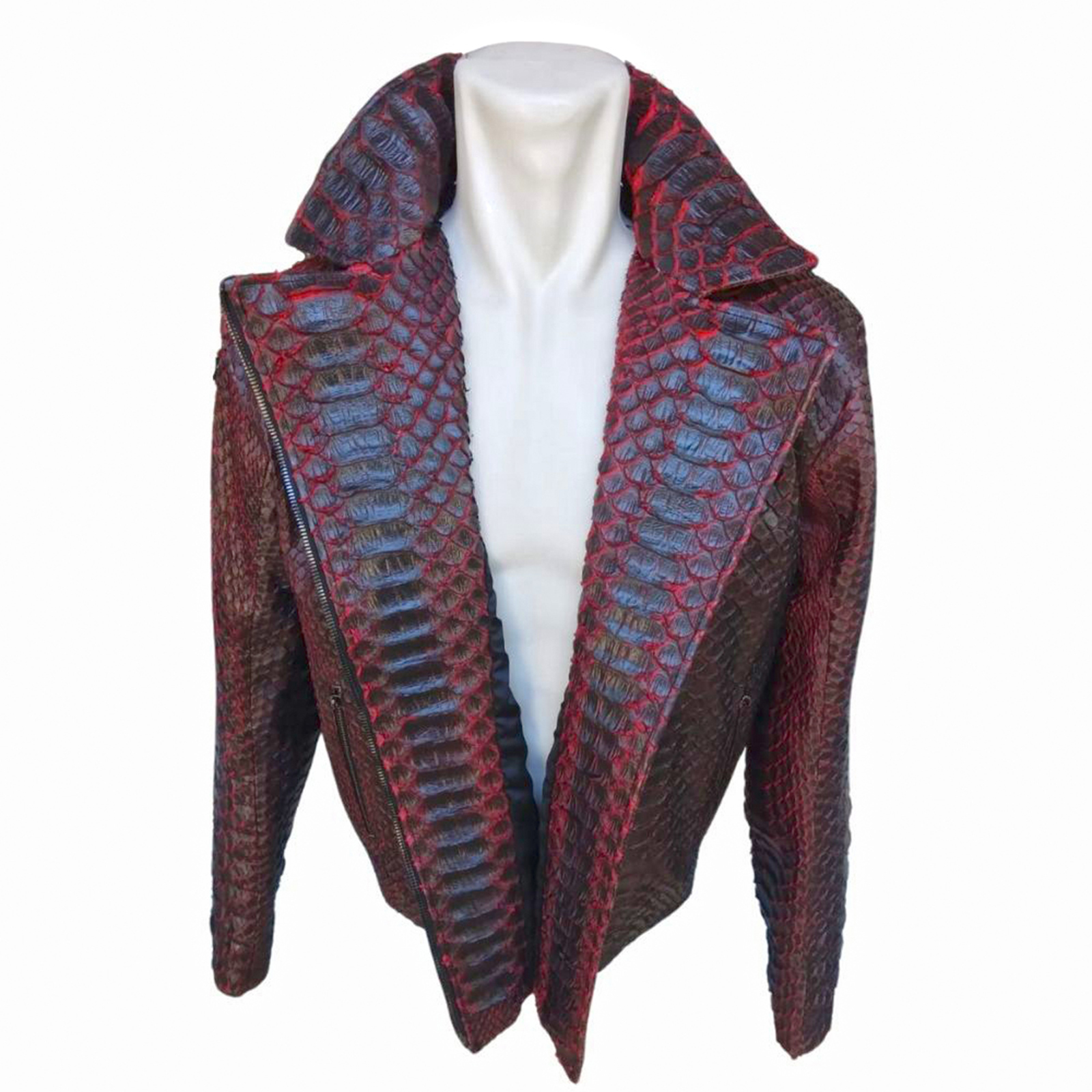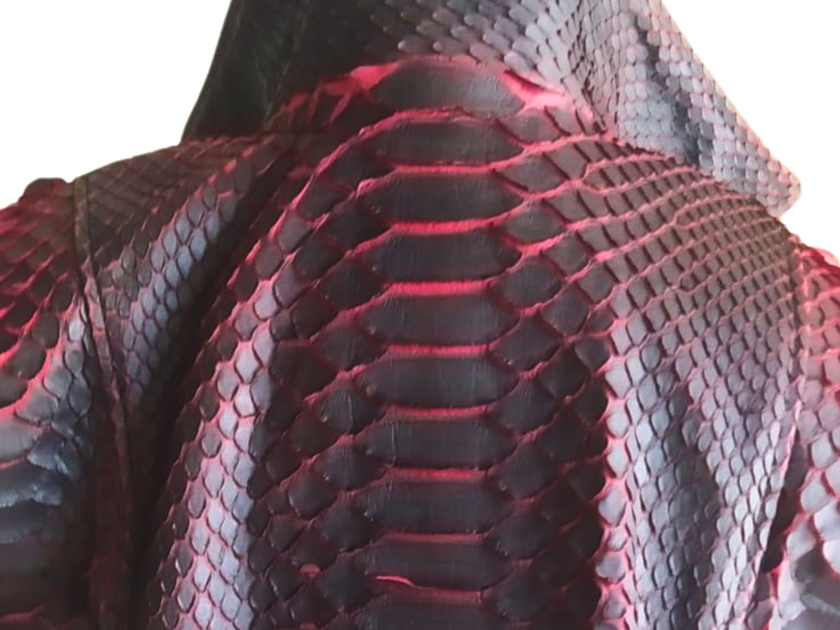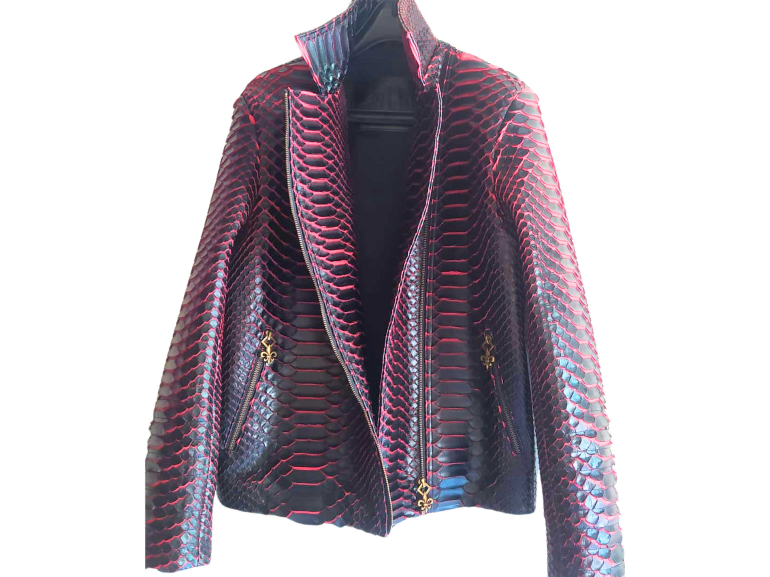 This Snakeskin Biker Leather Jacket style men or women leather jacket is inspired and made with genuine black python snake skin with red gradation. Durable jacket with a zippered front and fitted or elastic waist and cuffs. This iconic black biker jacket is handcrafted from high-quality snakeskin leather with a soft silky fabric inner lining for maximum comfort.