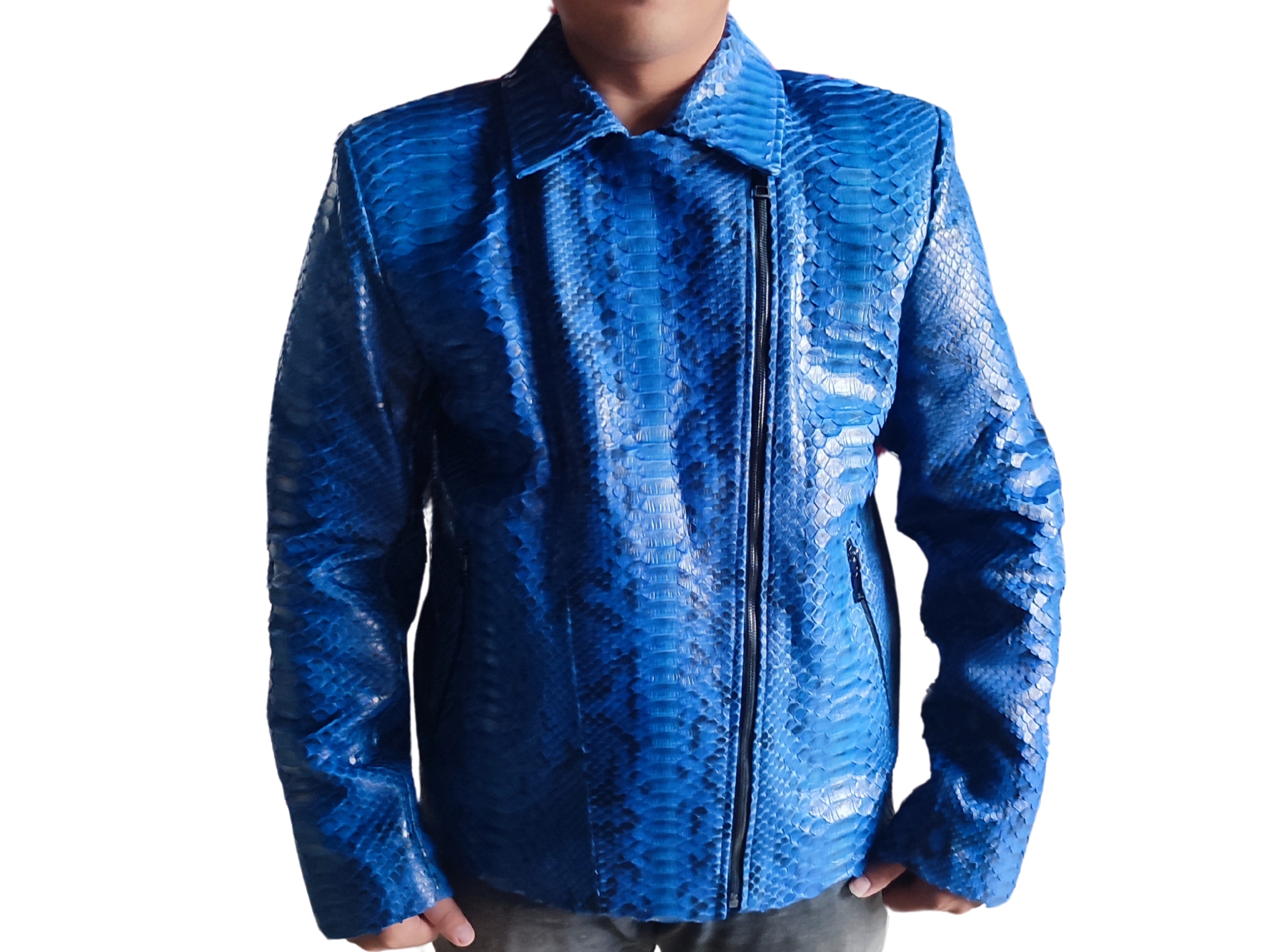 Ride in style with our Blue Snakeskin Motorcycle Leather Jacket. Made with genuine leather, this jacket combines edgy and luxurious elements. Stand out from the crowd and feel confident while cruising down the road.